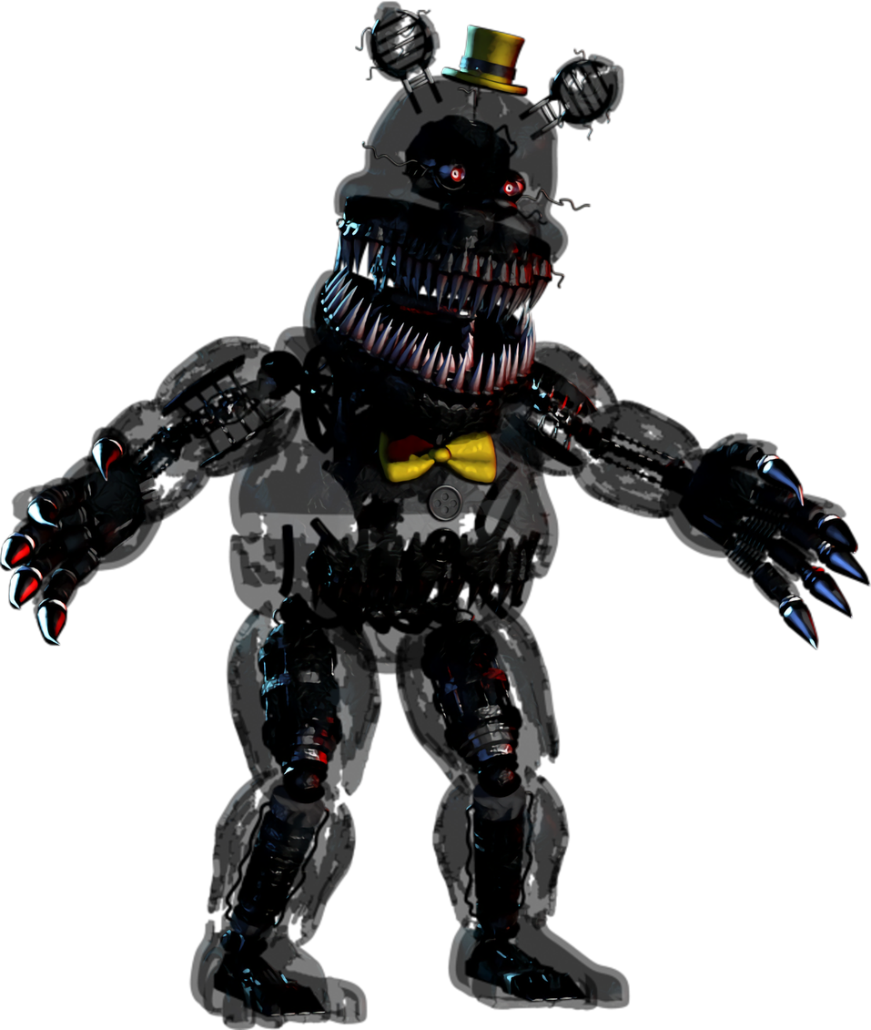 Nightmare Freddy is a mutated and heavily damaged bear animatronic. Attached to his body are three animatronics in the form of little Freddies called 'Freddles' The first 2 halloween animatronics as seen on a sticker - Jack-O-Bonnie and Jack-O-Chica